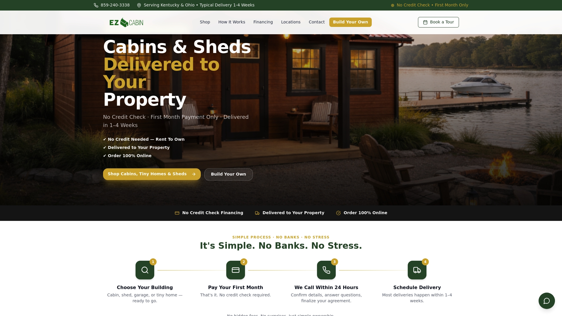 EZ Cabin focuses on accessible ownership through a rent to own program, online ordering, and local delivery. Customers can customize and preview options with AI powered tools before they pay the first month and schedule delivery within 1 to 4 weeks.