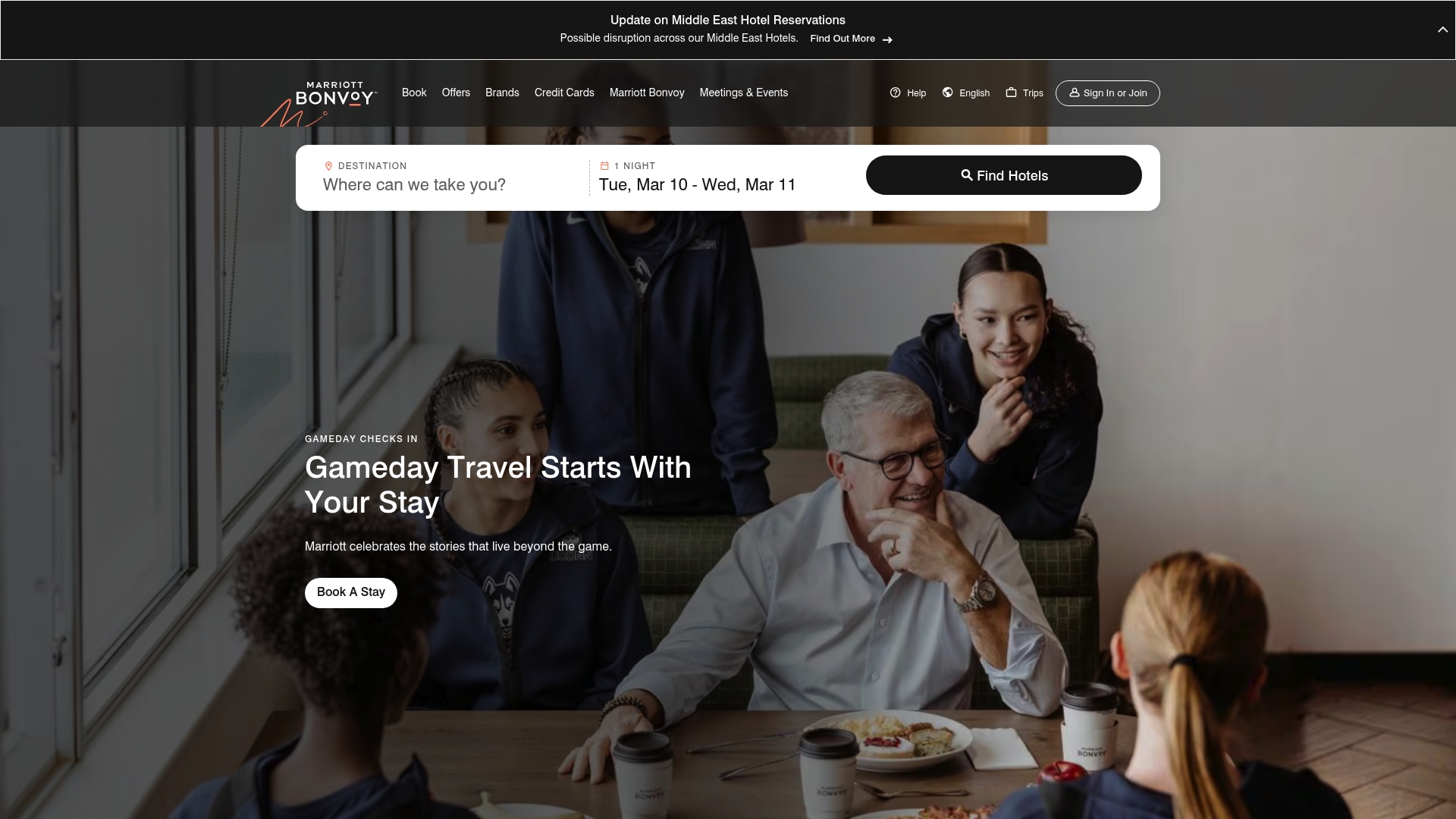 A business traveler books a room for an international conference through Marriotts official website and earns loyalty points for the stay. A family from Ohio chooses a nearby Marriott for a weekend while evaluating a cabin purchase in Kentucky.