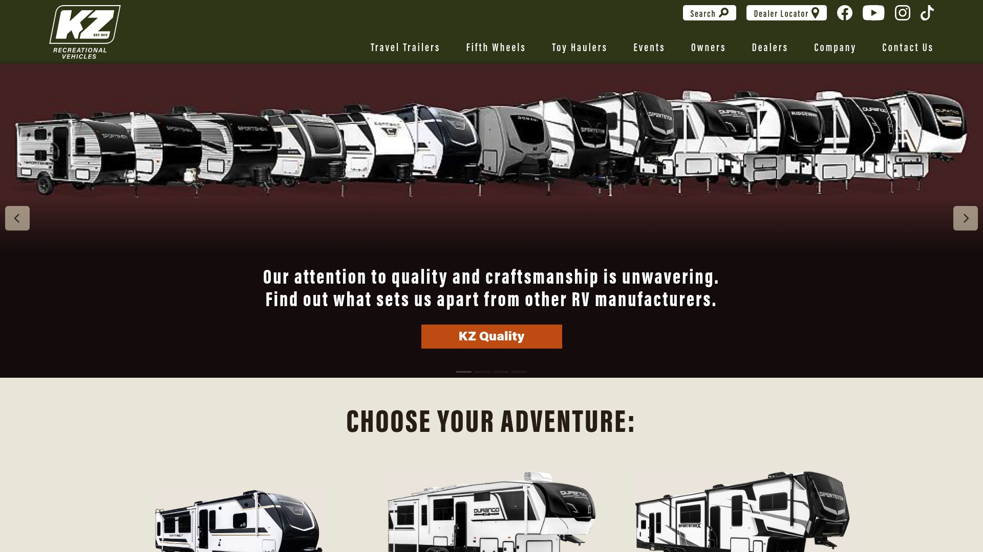 KZ RV offers travel trailers, fifth wheels, and toy haulers across a diverse model range that suits weekend camping and extended road trips. The company includes a two year hitch to bumper warranty, optional solar systems for off grid power, and an online merchandise store for accessories.