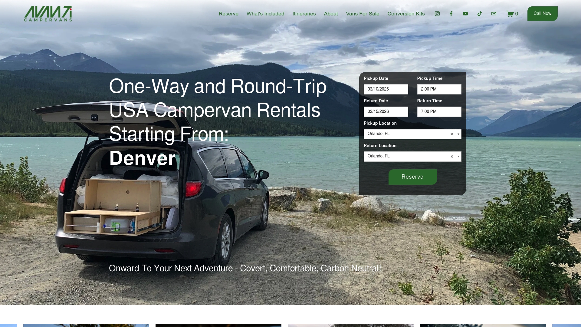 Avanti includes 24/7 pickup and return, 150 free miles per day, and a full kit of linens, towels, kitchen gear, chairs, a shade canopy, and a cooler. The vans support stealth, carbon neutral camping and are available near major airports in the USA.