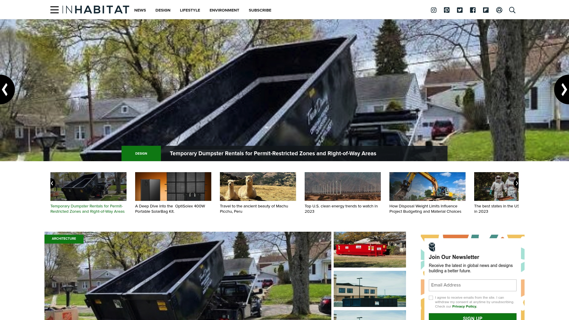 Inhabitat aggregates the latest news on environmental issues, sustainable architecture, and green technology across themed categories. The site offers in depth articles, galleries and images, practical how to guides, social media engagement, and a newsletter subscription for regular updates.