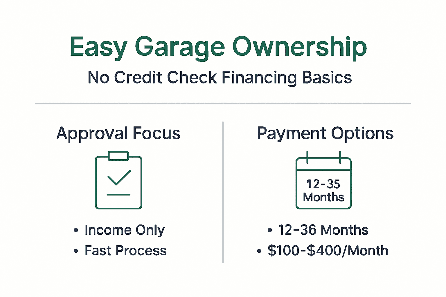 - No credit score requirements eliminate the largest barrier to garage ownership
