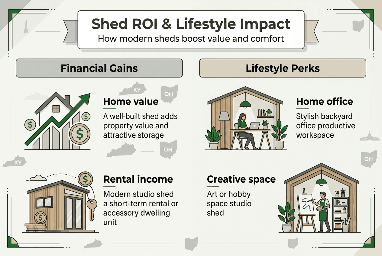 | Property value boost | Modern sheds increase home values by 5-10% in Kentucky and Ohio markets |