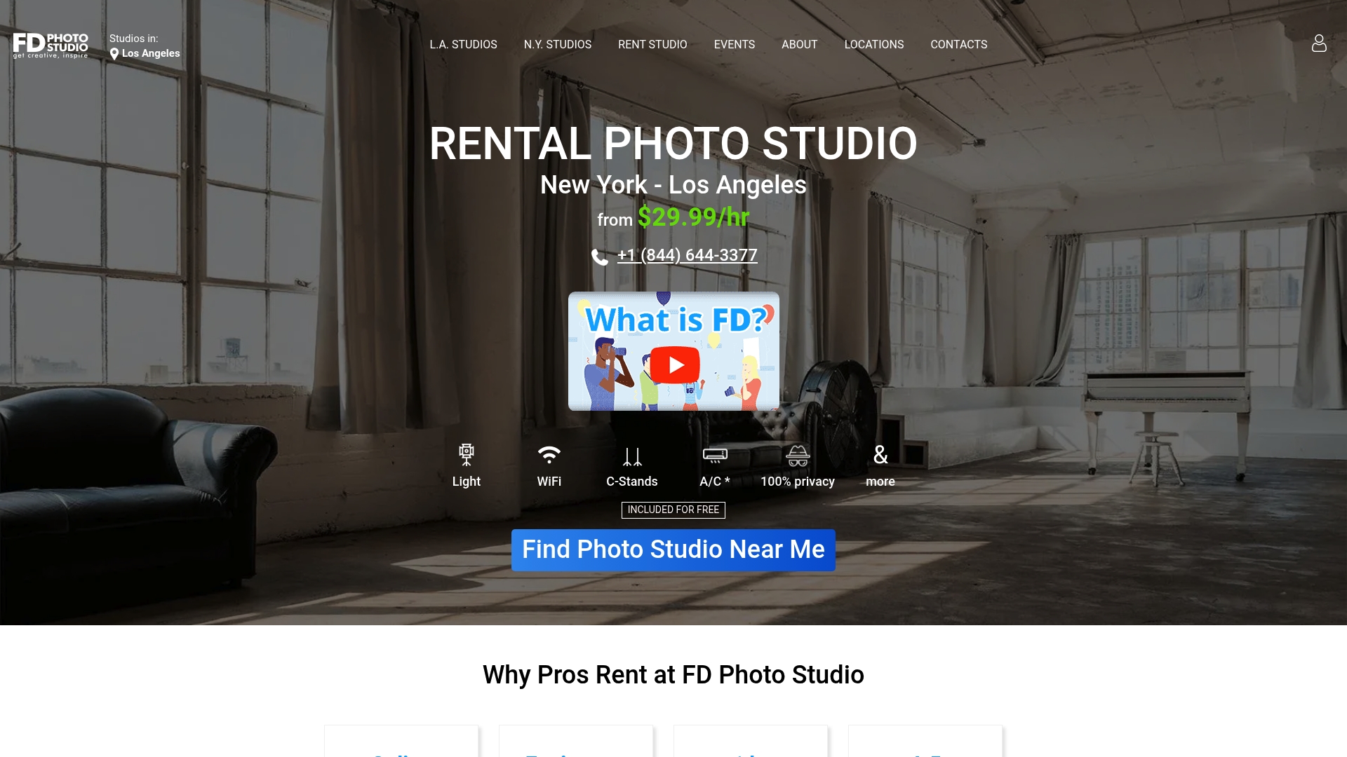 FD Photo Studio provides a broad network of rentable photo studios across Los Angeles and New York, aimed at photographers and videographers who need flexible, professional space. The service balances cost conscious hourly rates with included equipment and themed sets.