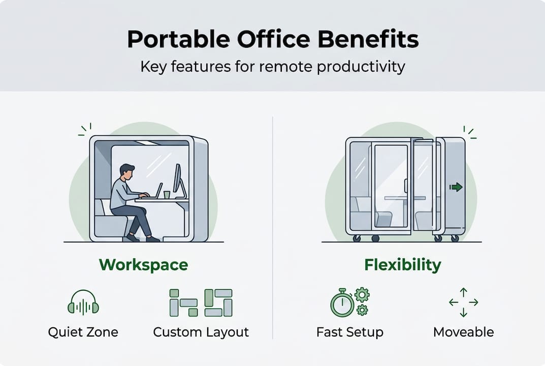 | Flexible dedicated workspaces | Portable offices provide a separate professional environment that supports organized workflows and professional video calls. |