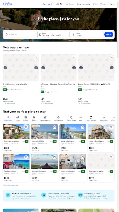 VRBO provides a wide selection of rental types across global listings and includes user reviews and ratings for each property. The platform supports a secure booking process with customer support and offers filters for price, location, amenities, and property type.