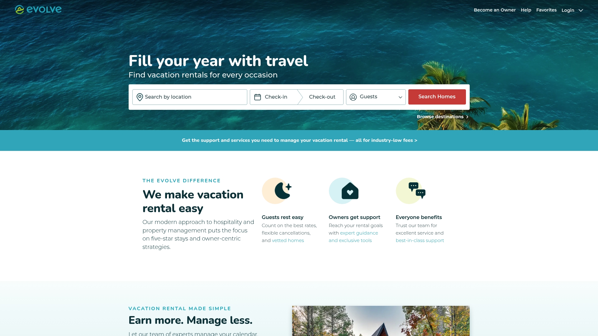 Evolve combines a broad vacation rental inventory with a clear focus on owner support through management services and owner tools. That combination appeals to owners seeking passive income while keeping the guest experience simple and dependable.